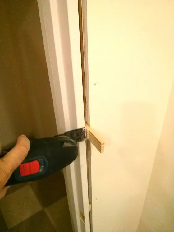 As you shim, the shims will stick out beyond the wall and the door frame. Do not be concerned about this. You’ll cut these off after the install is complete. You can use a sharp razor knife, but the safer tool is a vibrating multi-tool that resembles what a barber uses to cut your hair.
